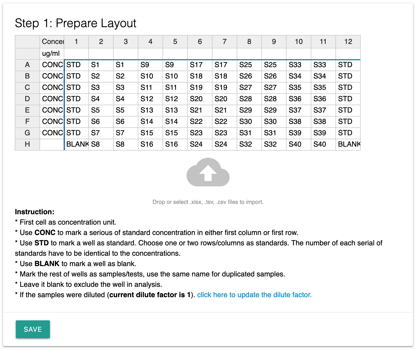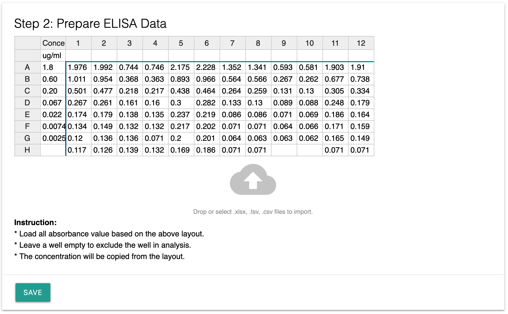 Once you added the widget, you can prepare the ELISA layout by typing or import the data directly from your excel file. You can do so by dragging an excel file into the cloud area.