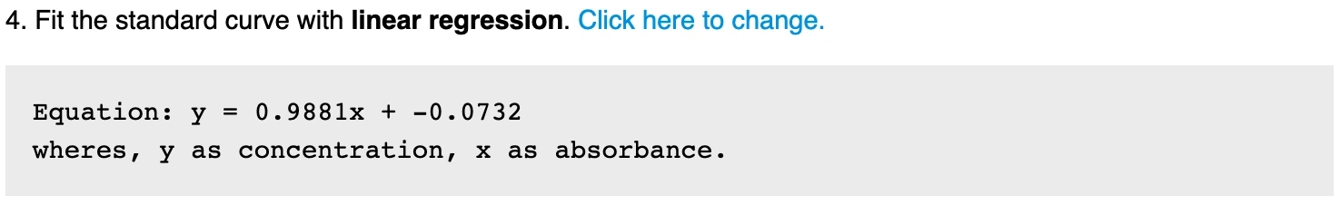 3. Generate the average absorbance of the standard If multiple standards are used, the absorbance of the standard at the same concentration will be calculated. This value will be used in plotting and fitting. 4. Fit the standard absorbance On default, Labii electronic lab notebook uses linear regression to fit the standard absorbance with the standard concentrations. Labii also provide you the option to use other regression methods. You can click the edit icon to change the repression method: