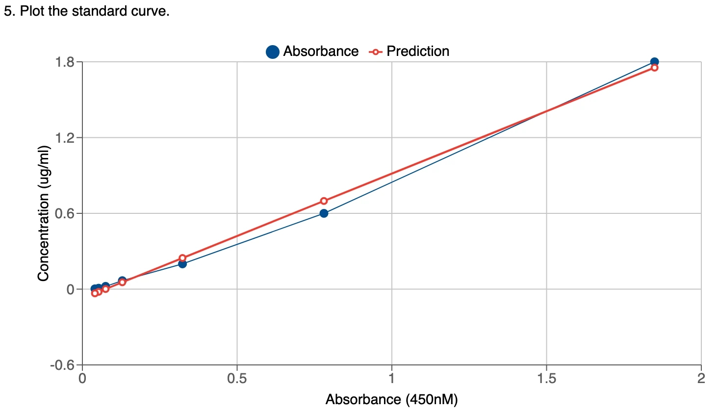 5. Plot standard curve A standard curve for the target protein by plotting the mean absorbance (y-axis) against the protein concentration (x-axis). A best-fit curve through the points in the graph will also be added based on the calculated value from fitting.