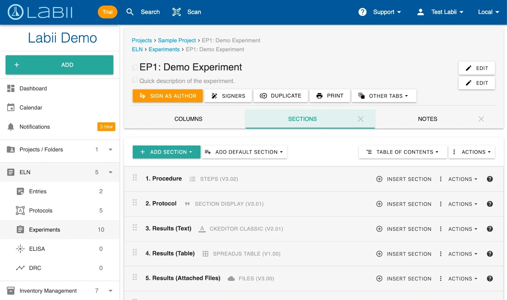 In contrast to R&D, the SOP or protocol, as it is known in the production process, has already been well-established. Documenting the steps of doing things are usually less significant in the production process. Researchers will usually capture certain specific details from tests as opposed to documentation of the steps. The experiments carried out in science production, such as CRO, are not as sophisticated as enterprise production, and all steps are still more restricted than those implemented in R&D. As a researcher, you will usually have to follow a specific design format produced by the company in order to conduct experiments and capture results. It is also important to note that these cases are also related to some of the routine experiments carried out in R&D research. As a result, a template is usually designed and used by the scientists in this case. The structure of the template consists of several segments, such as Overview, Procedure, Results, etc. In order to enable scientists to document the electronic lab notebooks in production, Labii has developed the section view which displays an experiment in pieces by section. Specifically: