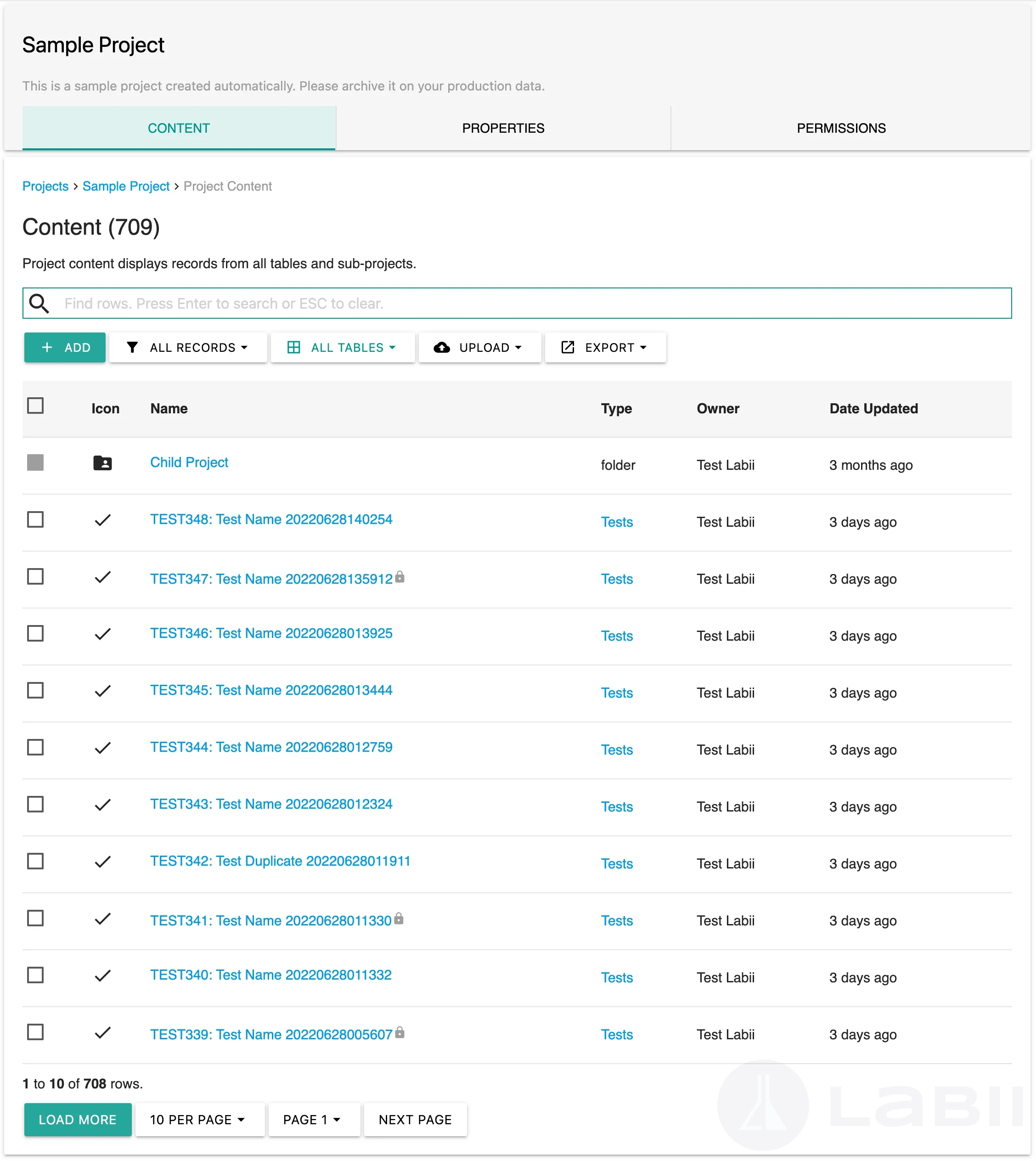 The project list view lets you view records for a particular project. Using the project list view, you can view records from all tables, as well as sub-projects. The project list view can be accessed by clicking on the project in the side menu.