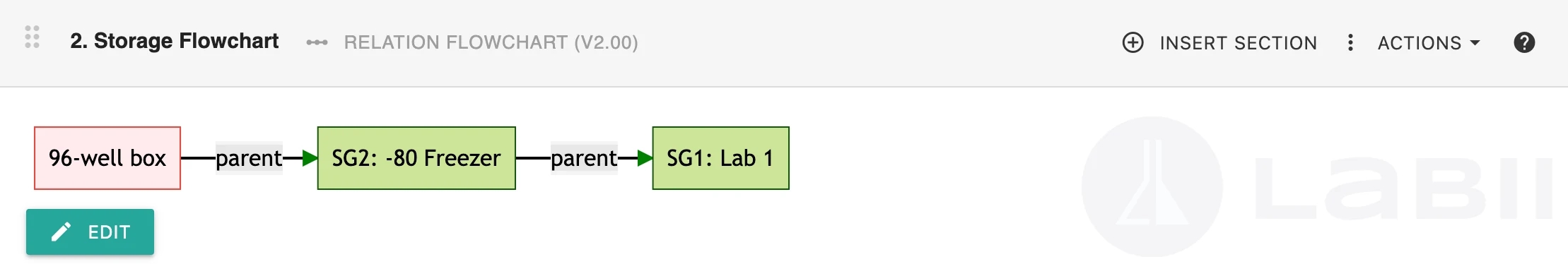 Flowchart for finding storage locations. The Labii system generates a flowchart showing the relationship between parent and child storage so you can find it at a glance. Each box can also be clicked to navigate between different levels of storage.