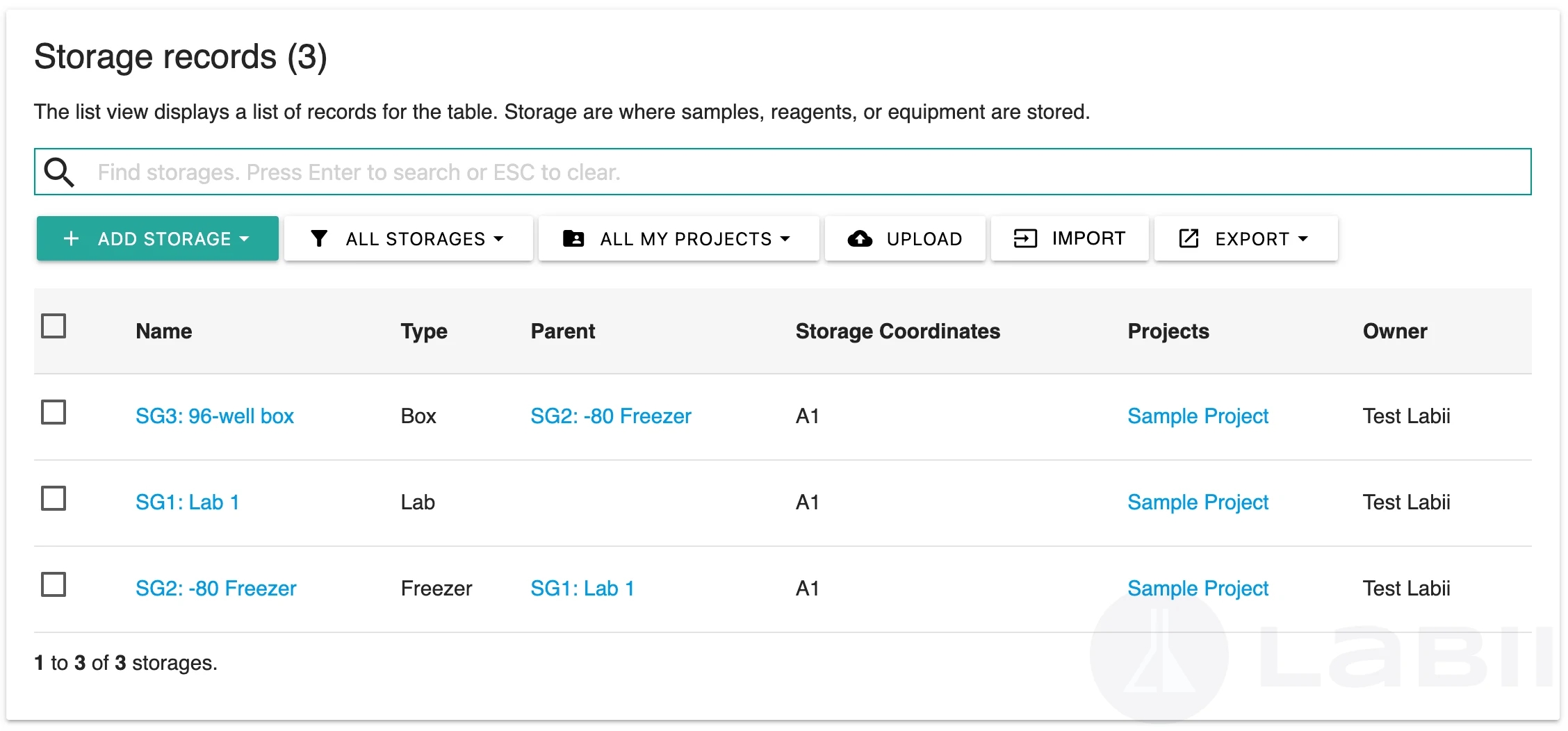 Robust and customizable. Labii's storage management system is robust and allows you to track storage types and sizes, manage parent-child relationships, and monitor storage usage. You can also customize it to track other fields you are interested in.