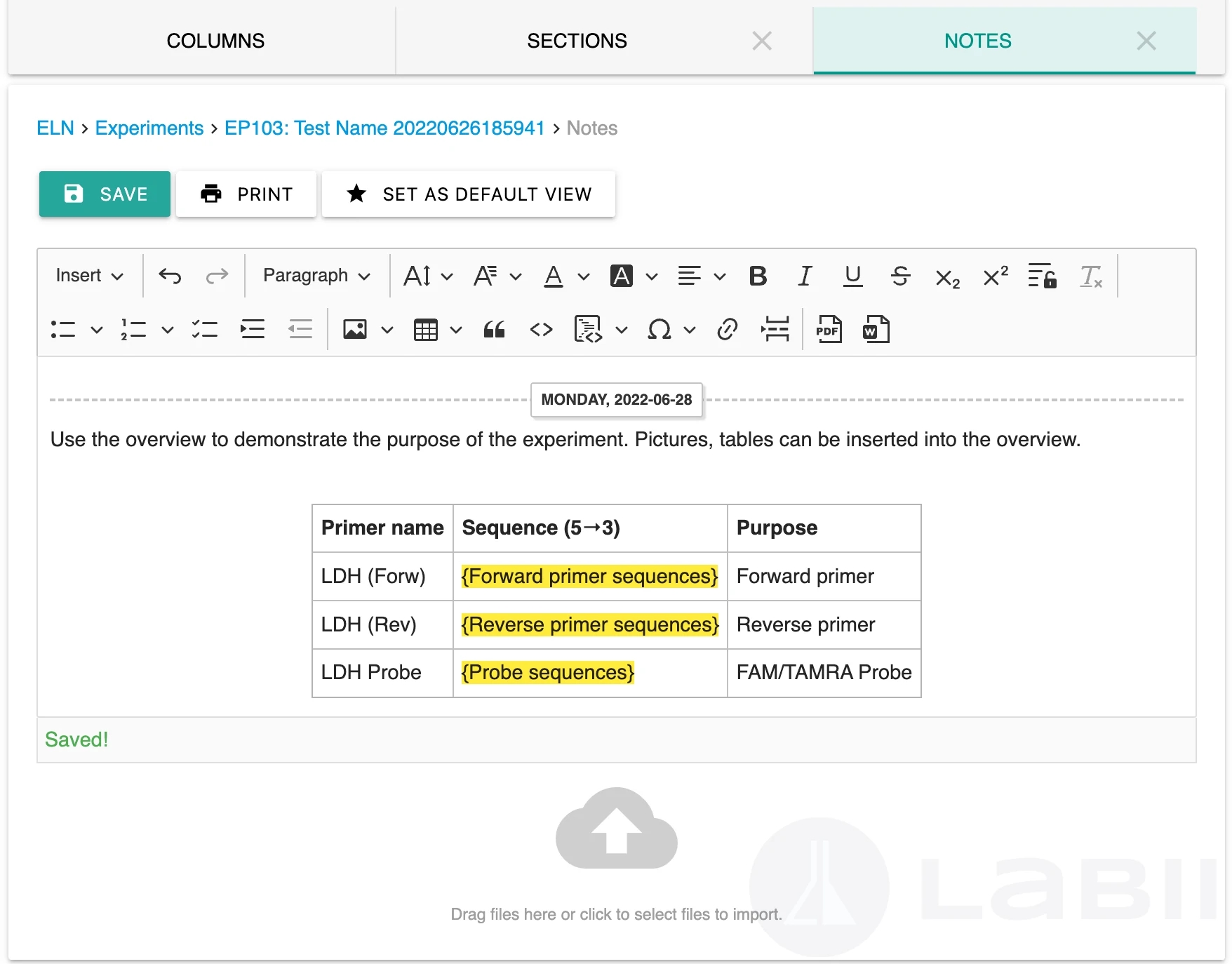 Labii Electronic Lab Notebook (ELN) released the Notes feature to make it easy and accessible for researchers to document their research data in a segment of each day. The focus of research and development is usually on innovations and proof of concepts. A small set of samples is usually conducted by researchers, using different methods to accomplish this. As long as the data generated by researchers can be replicated by other researchers and meets the regulatory requirements, there are no requirements as to what should be documented as part of research and development. Scientists would prefer that such results are captured as quickly as possible with as little effort as possible. As a result, they prefer to just write down what they did on one particular day. A rich text editor with support for different file types can be well suited for their needs in this case.