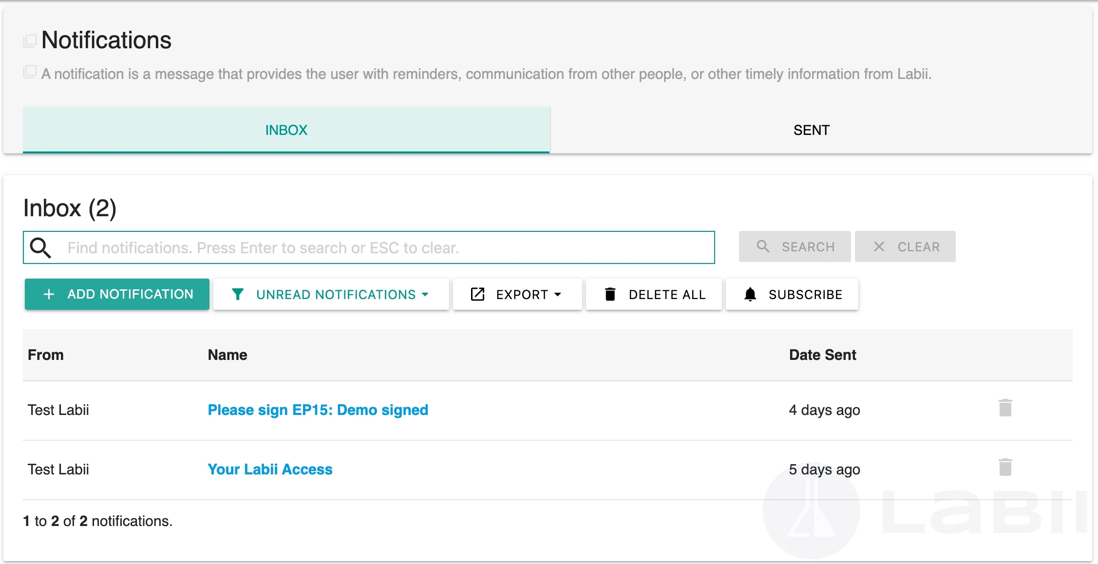 A notification center is a center that contains messages providing the user with reminders, communication from other people, or other timely information from Labii. With Labii's notification center, you can stay informed about your Electronic Lab Notebook (ELN) and Laboratory Information Management System (LIMS) activities.
