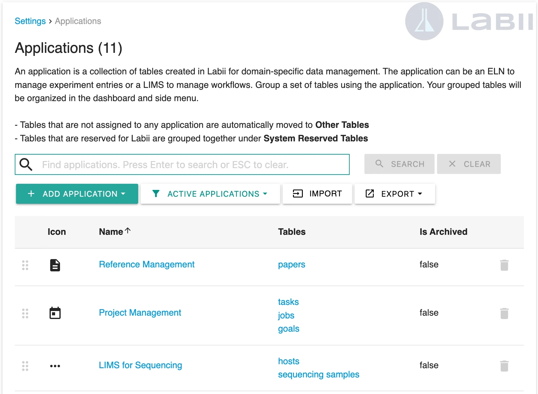 An application is a collection of tables created in Labii for domain-specific data management. The application can be an Electronic Lab Notebook to manage experiment entries or a Laboratory Information Management System (LIMS) to manage workflows. Group a set of tables using the application. Your grouped tables will be organized in the dashboard and side menu.