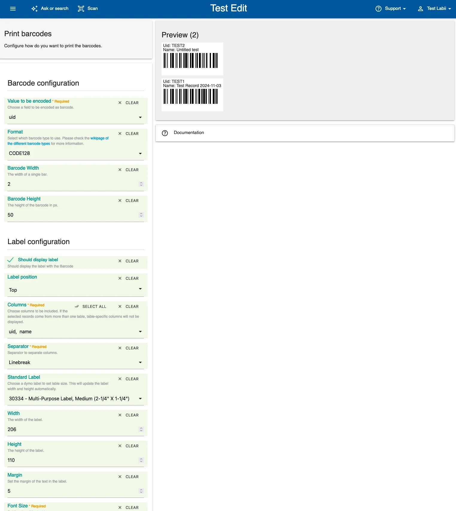 Using Labii, barcodes and QR codes can be generated automatically. In Labii, UIDs (Unique IDs) are encoded into both barcodes and QR codes by default. You can use both column widgets and section widgets to display barcodes. Learn more here.