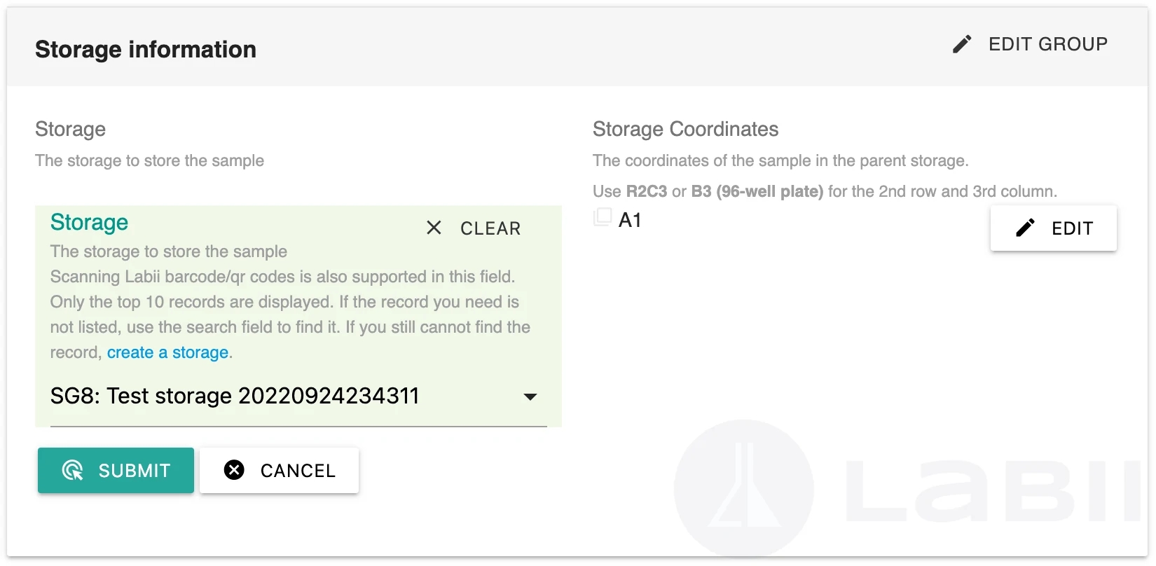 Scan-based automatic field selection. In the case of creating samples and assigning them to a storage box, it can be challenging to find the right storage identification and assign it to a sample. Labii thinks outside the box and provides the option for selecting the storage via a simple scan.