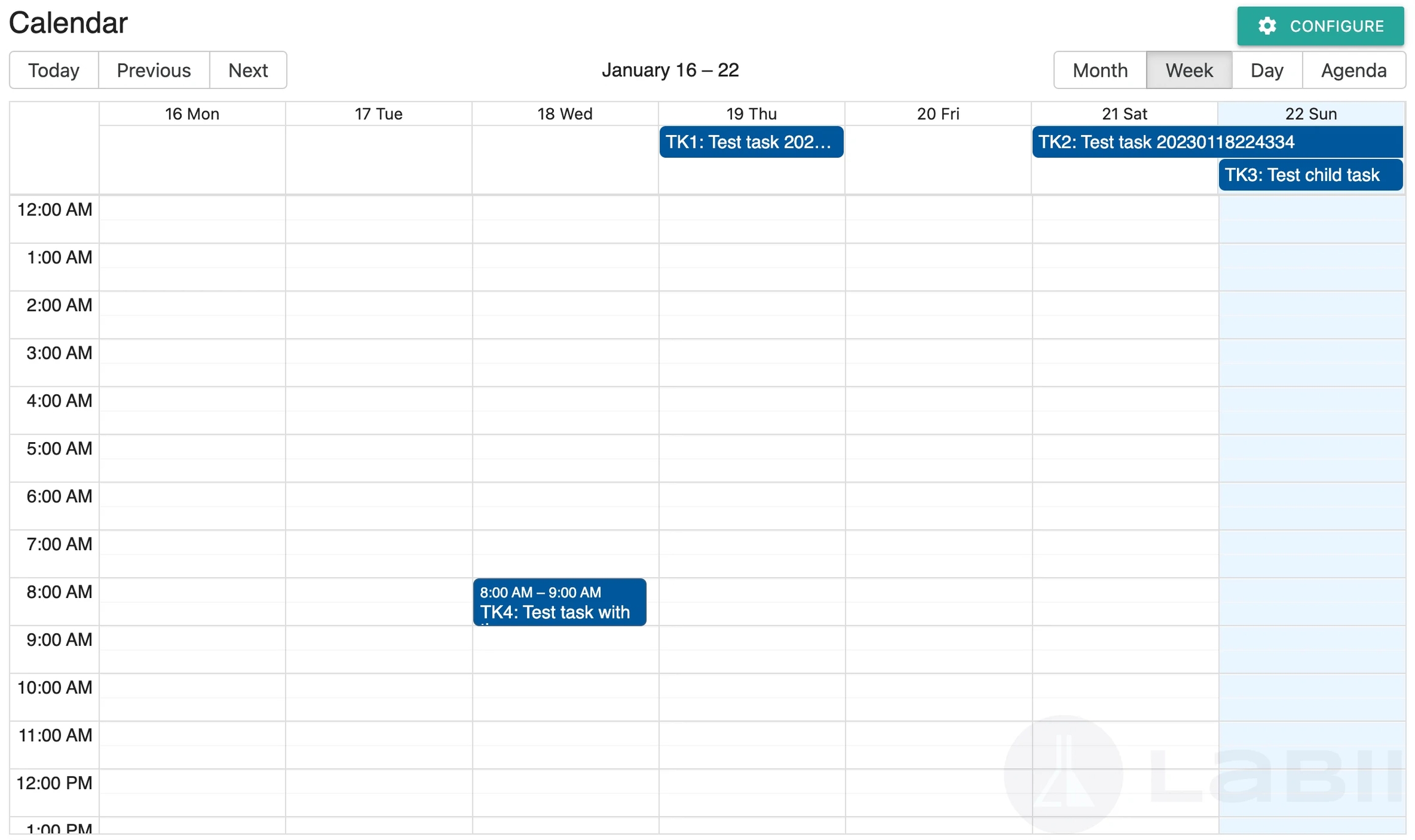Calendar to have a clear overview of tasks. Labii's calendar view is designed to help users manage their schedule and meet deadlines by displaying all their tasks on a calendar. This allows users to easily view their tasks by date and prioritize their workload effectively. The calendar view is a useful tool for users to have a clear overview of their tasks and deadlines, ensuring they are meeting them on time.