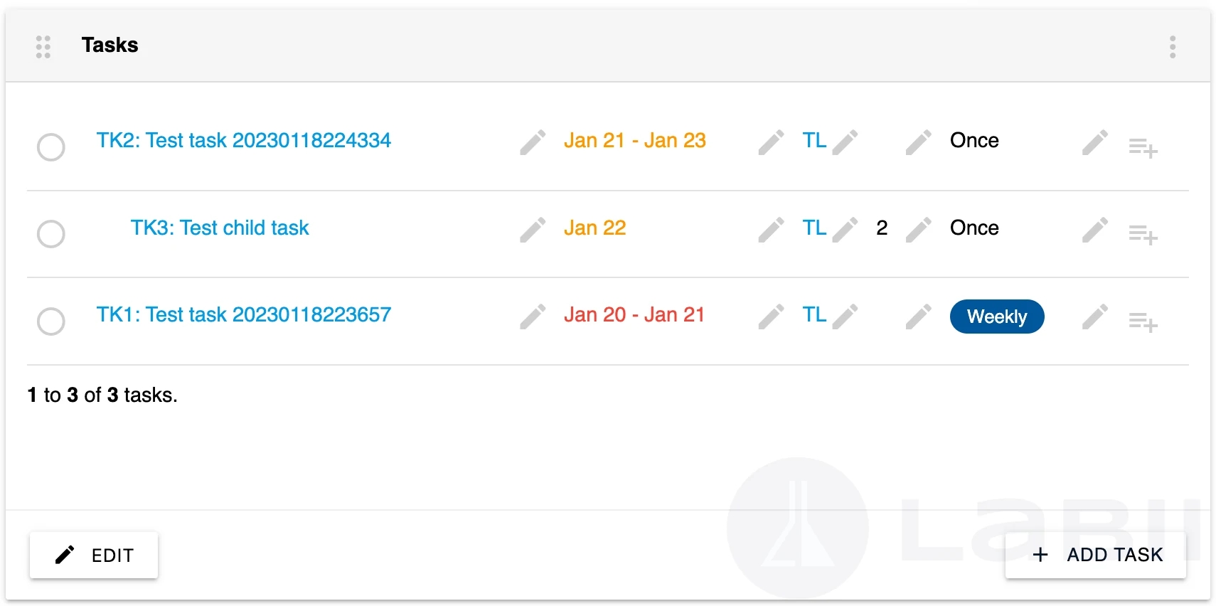 Simple and efficient to manage tasks with dashboard. Labii's task management feature includes a list view that allows users to easily manage their tasks. To provide a familiar experience to other vendors in the market, Labii also includes a tasks widget in the dashboard, which allows users to quickly complete tasks with a simple click and view subtasks indented under the parent task. The task dashboard is designed to make task management simple and efficient for users.
