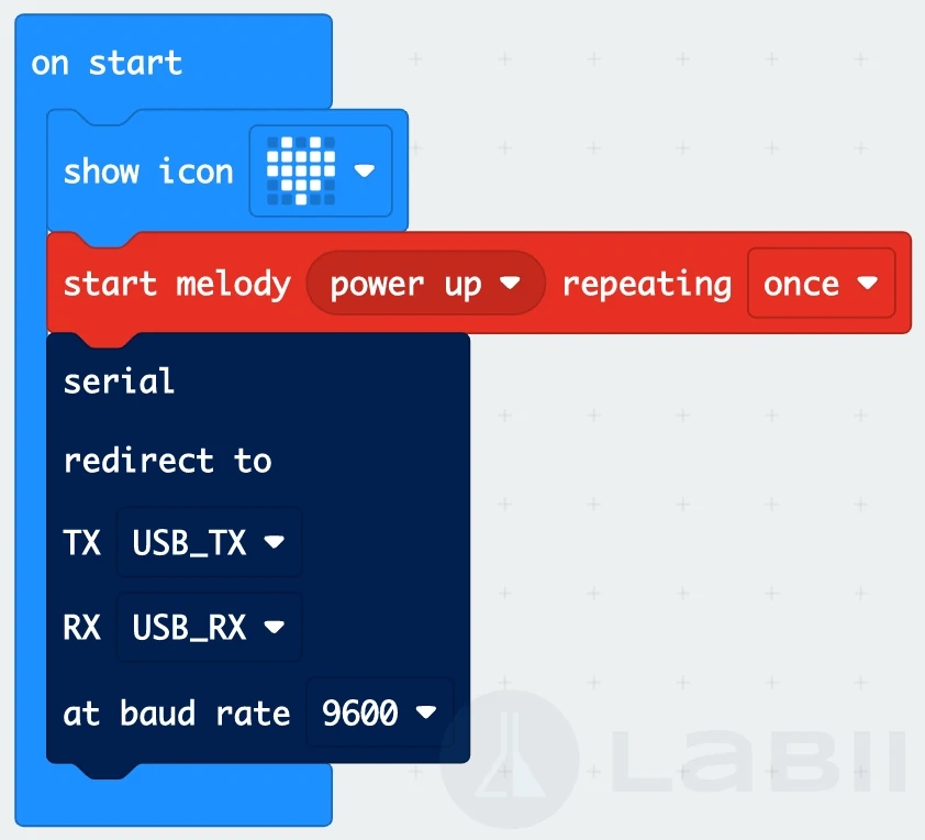 4. For button B being pressed, serial write string “LABII”, and then start melody “ba ding”.