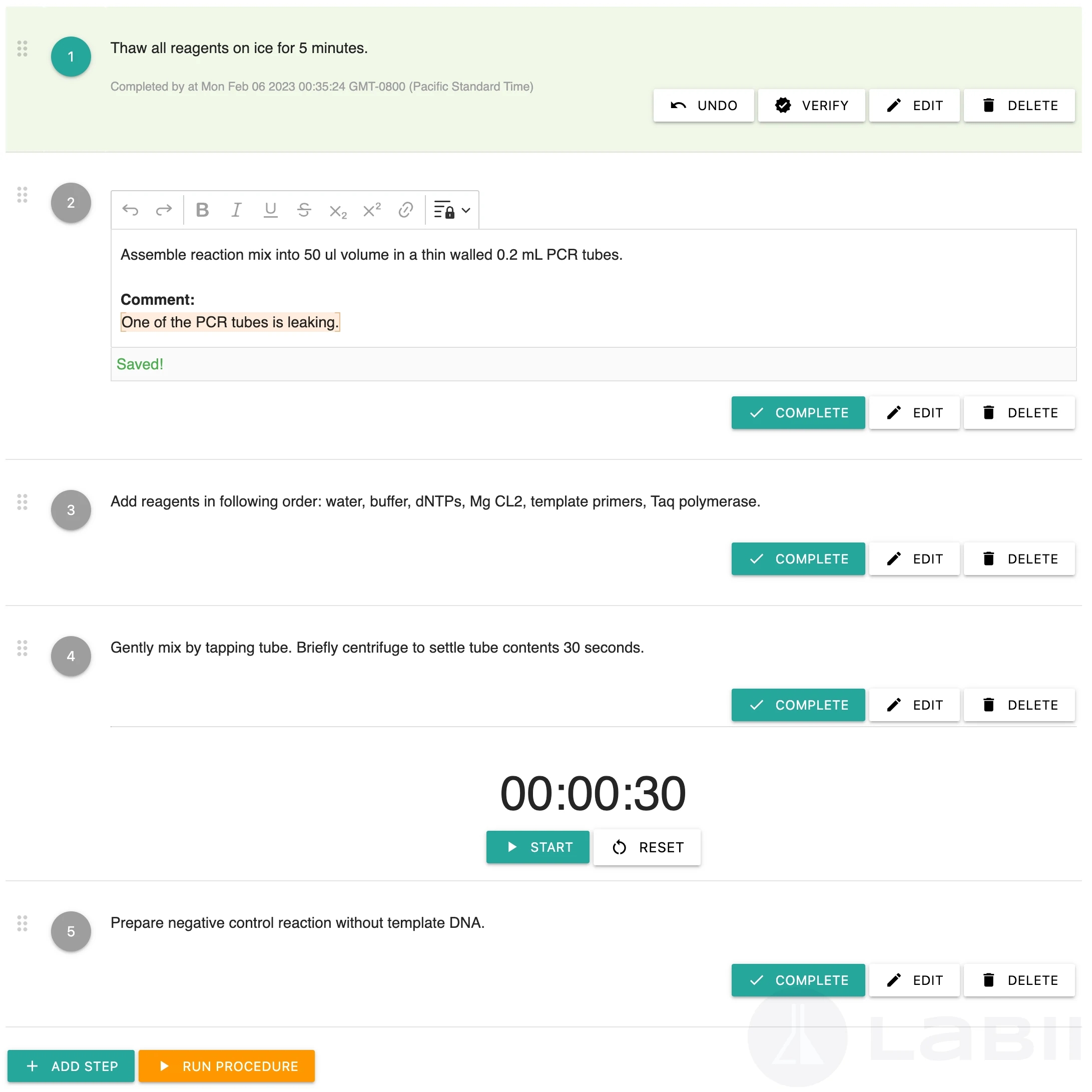 Labii's Steps widget is a flexible and efficient solution for tracking experimental processes. It includes several features that make it an excellent choice for researchers who want to manage their data, experiments, and workflows more efficiently. With rich text formatting, insert function, restrict editing, complete and verify actions, timer function, and run procedure function, Labii's Steps widget provides a complete solution for tracking experimental processes. By using Labii's Steps widget, researchers can save time, reduce errors, and improve the accuracy and reliability of their experimental processes. To learn more, schedule a meeting with Labii representatives (https://call.skd.labii.com) or create an account (https://www.labii.com/signup/) to try it out yourself.