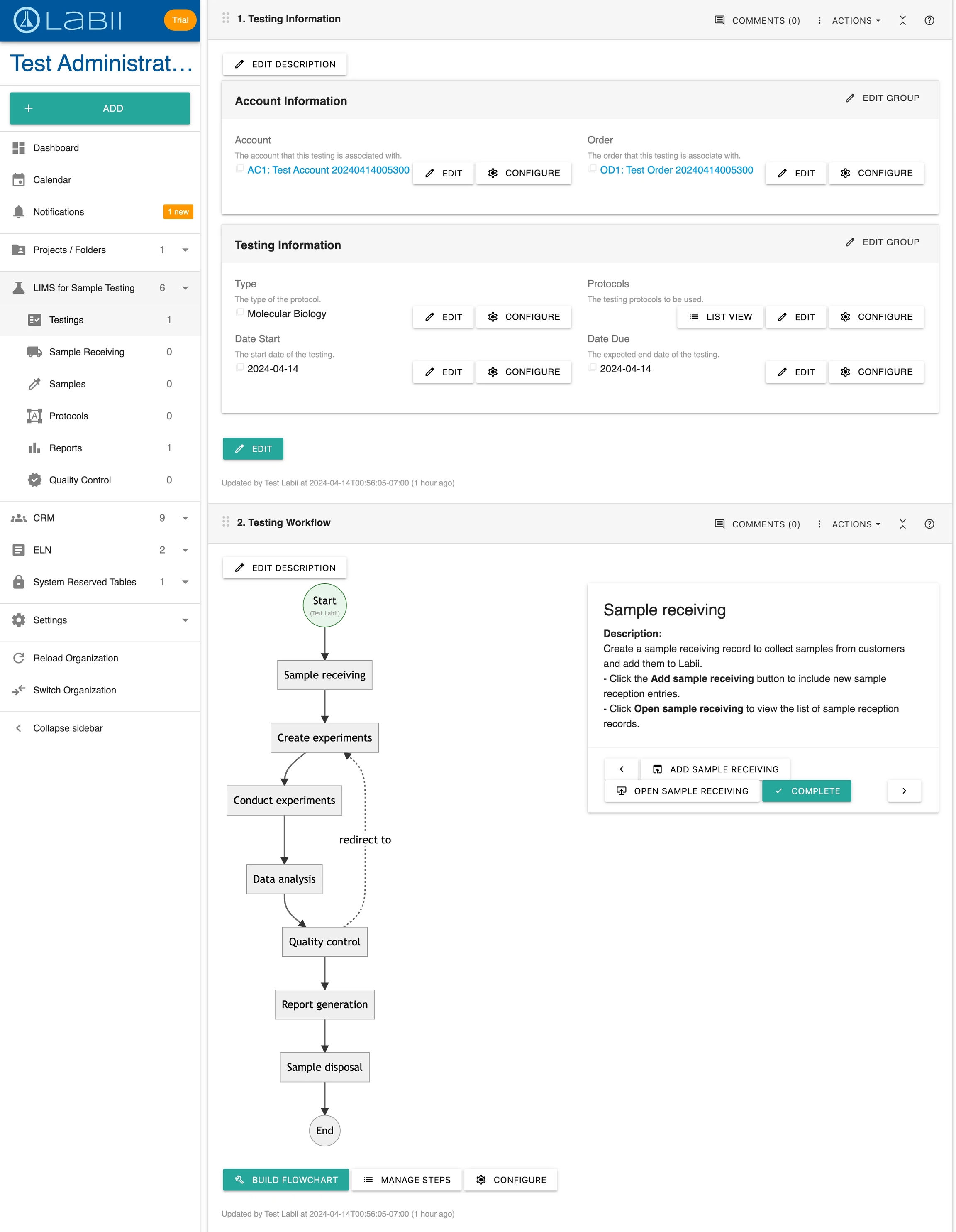 Labii LIMS for Sample Testing is a powerful and flexible solution for documenting all data related to your sample testing workflow. With its seamless integration with Labii CRM, Inventory Management, and ELN, along with a predesigned testing workflow, Labii LIMS simplifies the entire process, allowing you to focus on accurate analysis and decision-making. Whether you're in the pharmaceutical, food and beverage, or environmental science industry, Labii LIMS empowers you to streamline your sample testing operations and achieve reliable results.