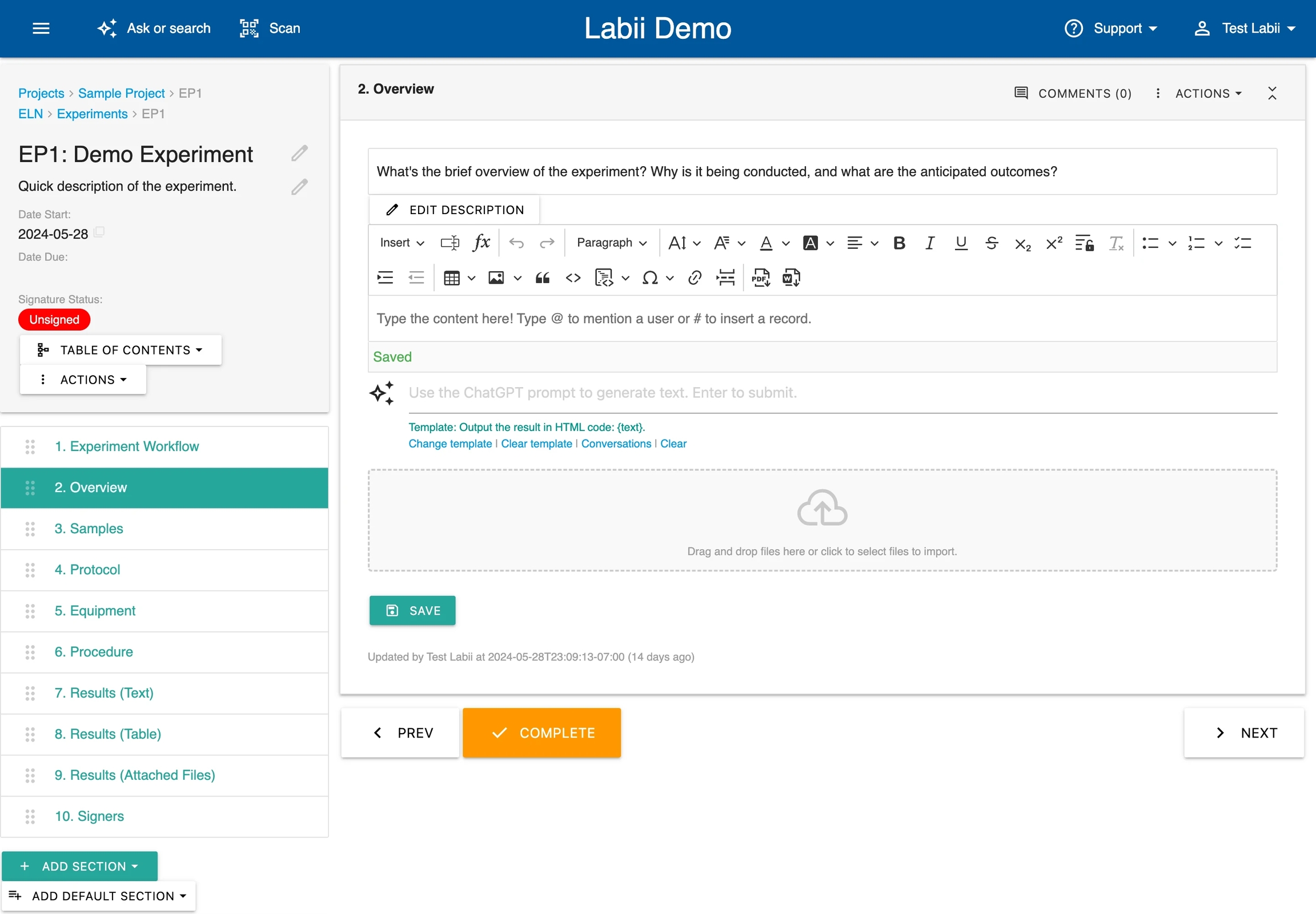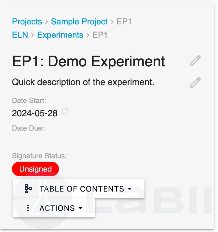 Experiment records: Access different sections, like samples, equipment, protocols, and results, with ease