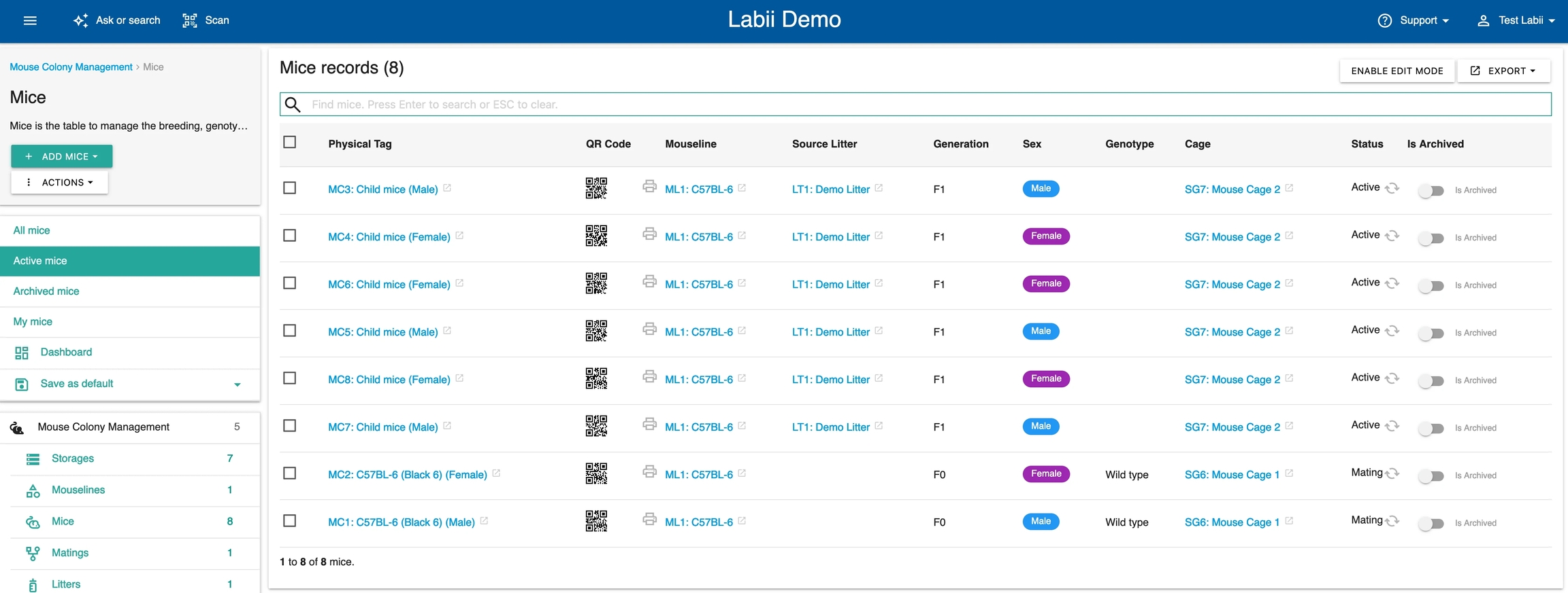 Labii is excited to announce the release of our new Mouse Colony Management solution, a tool designed to simplify and enhance the organization of mouse colonies for research labs.