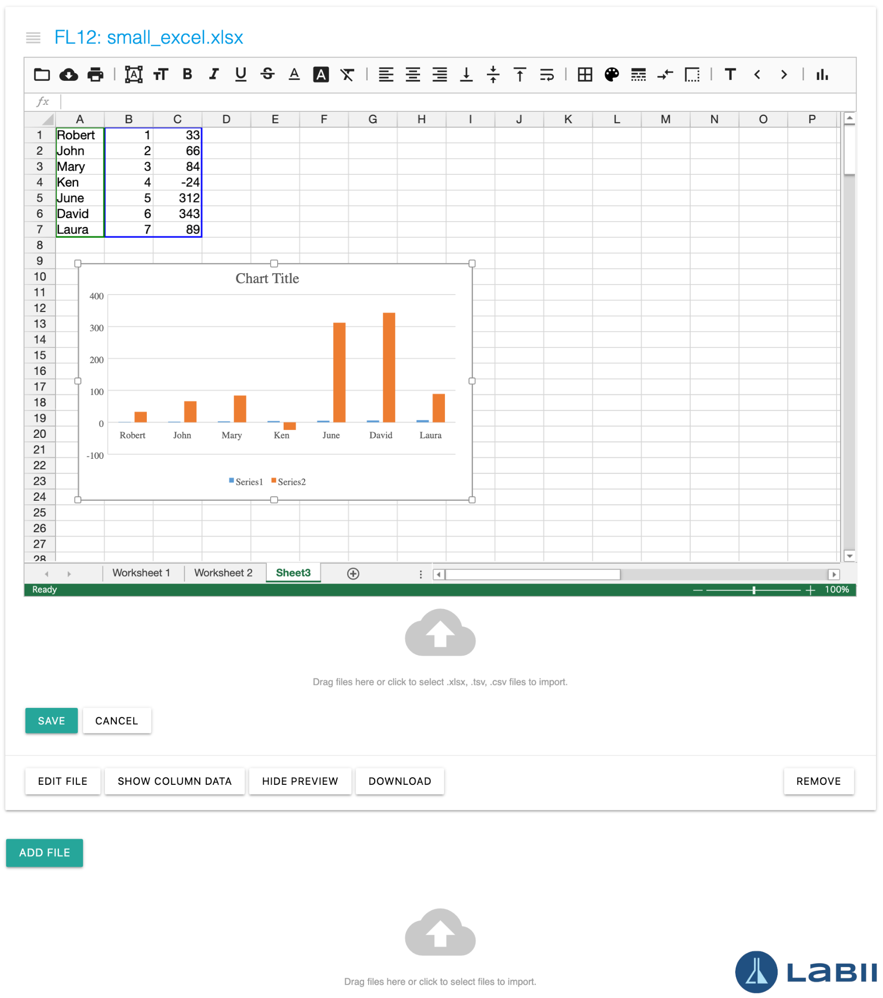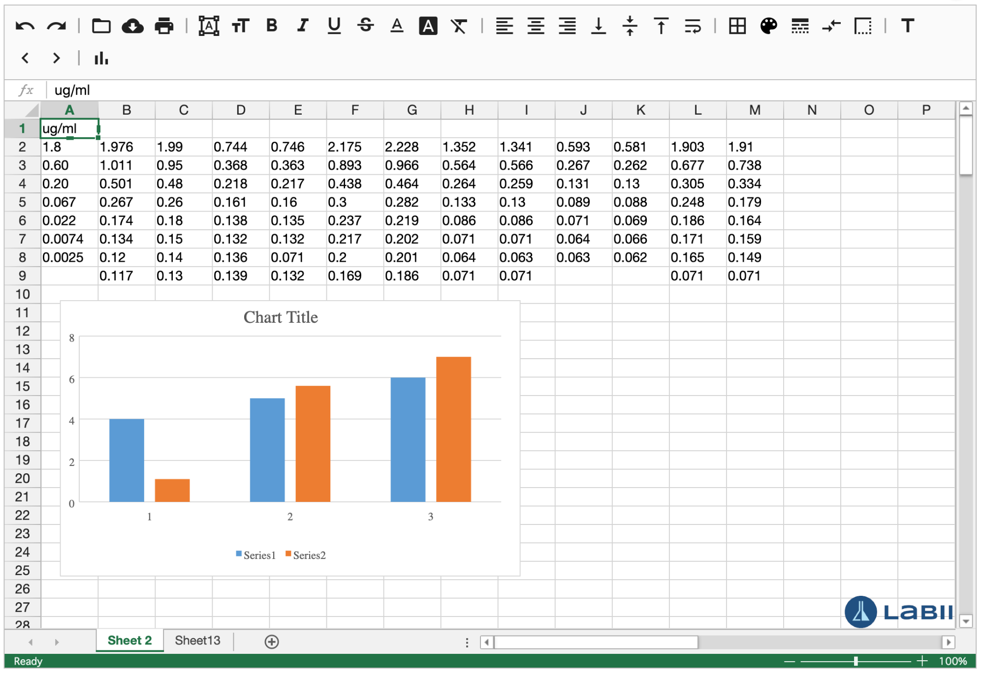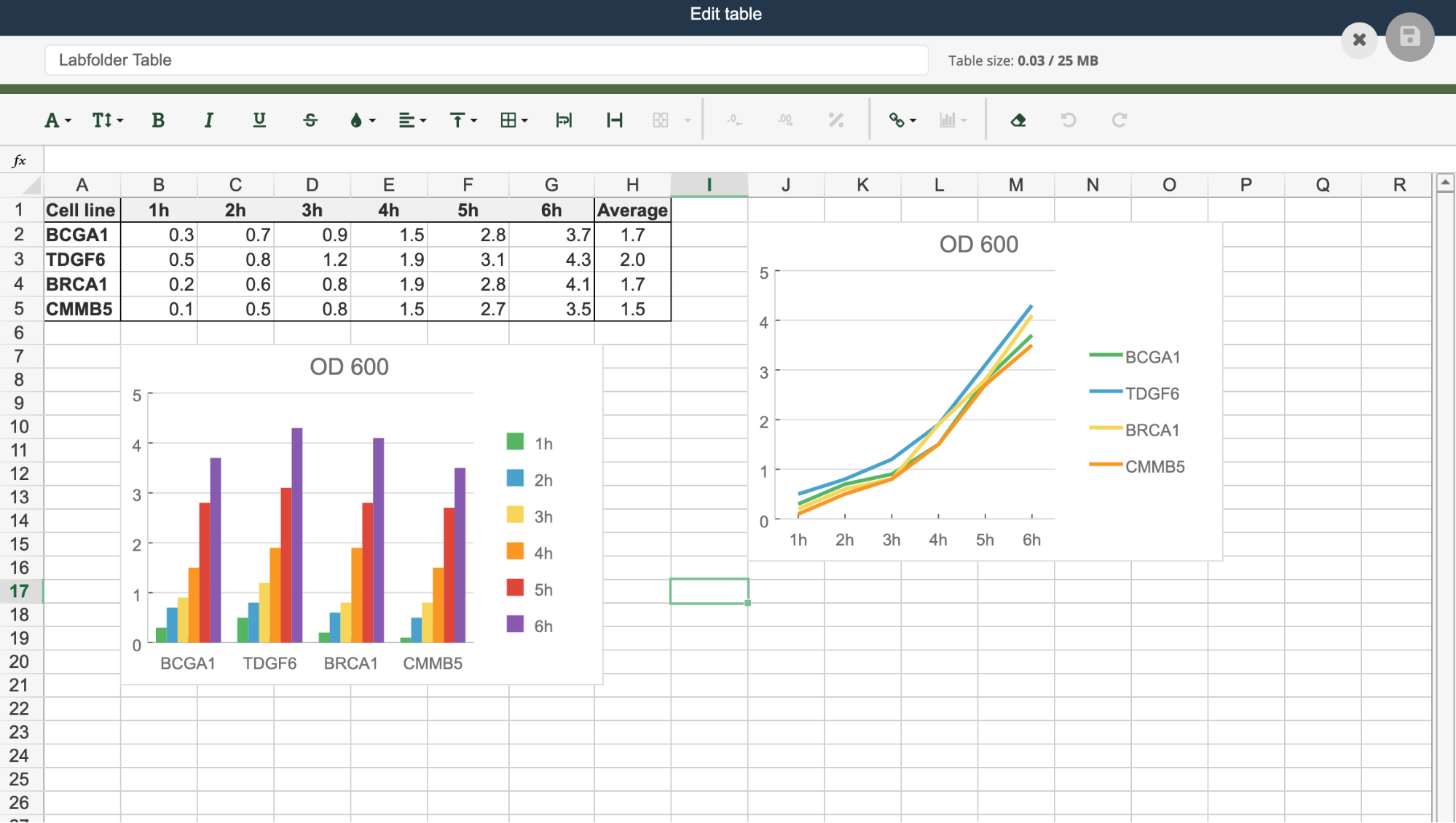 Table editors are also frequently used in the ELN to document tabular data. The basic functionality of both editors is similar. They both offer formatting options at the top. The toolbars on Labii are more user-friendly, and the icons are larger so it's easier to select the options. Labii stands out in that it provides chart functionality in the toolbar. One of the best features of Labii is its ability to import local file formats (.xlsx, .tsv, .csv). This is not possible with Labfolder. Due to its limitations, it is less desirable. Learn more at <https://docs.labii.com/widgets/office/table#spreadjs-table>&#x20;