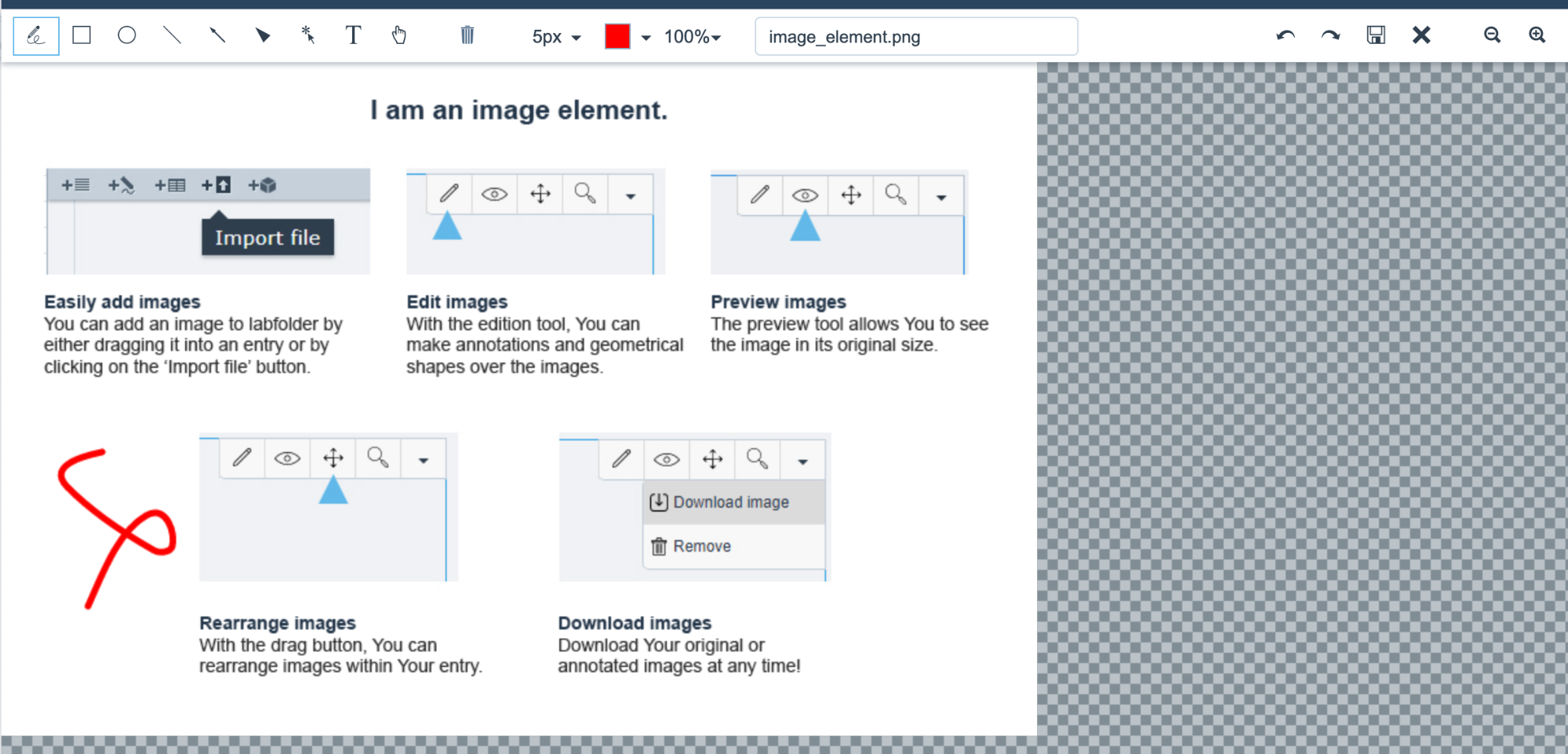 A good image editor is also vital in ELN as it can be used to edit the pictures to better annotate the findings. The interface and menu of Labii ELN make it far more preferable than its competitors. Labii comes with many advanced features. The top toolbar is well organized and contains all the icons you need to edit images. The icons are larger for accessibility. Comparatively to Labfolder, it is much more convenient to export and import local formats. Learn more at <https://docs.labii.com/widgets/office/drawing>&#x20;