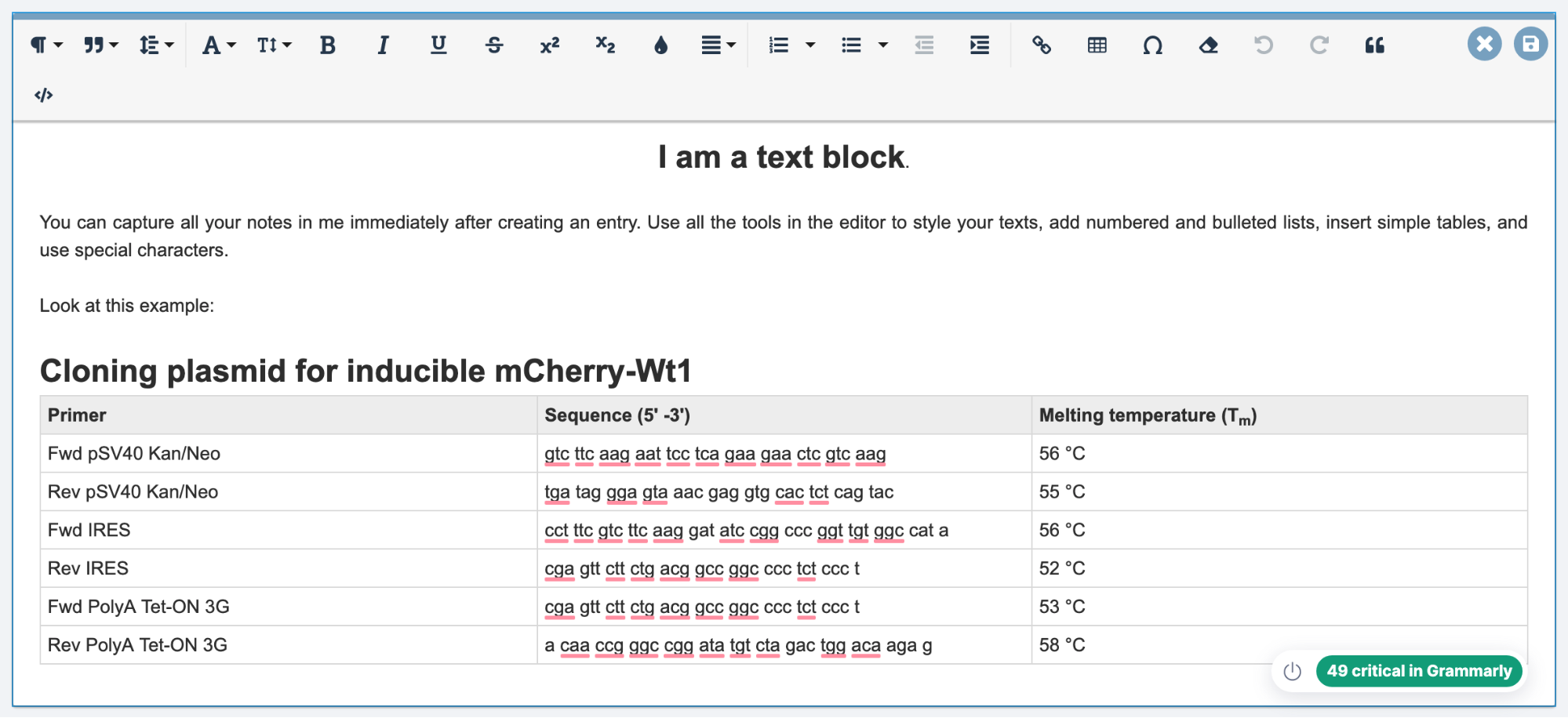 One of the major components of an ELN is the text editor, used for capturing the research data in text format. One can tell from a glance that Labii is much more capable when it comes to text editing. Basic text editing functions like formatting, tabular data formation, and bullet points are similar between both editors. Compared to Labfolder, Labii has the advantage of being able to import a wide variety of local documents from the computer. 1) Files of any type can be inserted into notes. One can easily import and edit all local formats (docx, .txt, .md, .csv, .tsv, .xlsx, .jpg, .png, .jpeg, .gif, .bmp). 2) Labii ELN is enhanced with widgets. In order to help you with your scientific research, Labii has created hundreds of widgets. It allows you to perform molecular biology, ELISA data analysis, chemical structure drawing, workflow management, etc. All of these widgets are now natively supported by the Labii ELN. This enables you to document your scientific research in an unlimited number of ways. 3) Increase document efficiency by inserting text from a section or file. When the text data has already been typed somewhere else, there is no reason to retype it. You can insert data from an external file document or a section with the insert text function in seconds. Additionally, text can be exported as pdf and docx. As a result, Labii is the more preferred ELN for text editing. Learn more at <https://docs.labii.com/widgets/office/text#ckeditor-classic>&#x20;